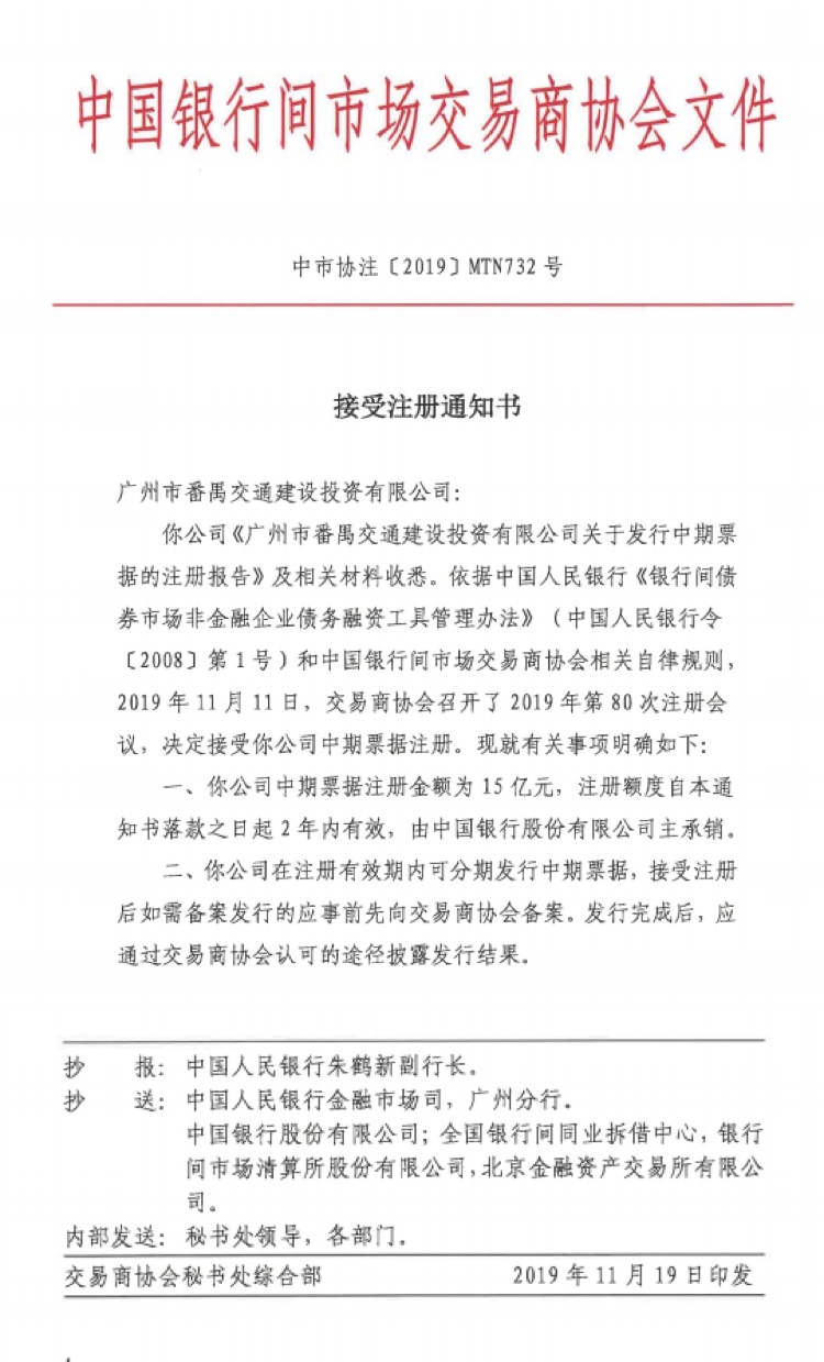 2019年11月19日,中國銀行間市場交易商協會出具《接受注冊通知書》(中市協注【2019】MTN732號),接受廣州市番禺交通建設投資有限公司(以下簡稱“番禺交投”)中期票據注冊,注冊金額為15億元,注冊額度為本通知書落款之日起2年內有效,由中國銀行股份有限公司主承銷。