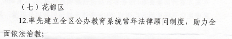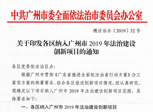2019年8月1日,中共廣州市委全面依法治市委員會辦公室印發《關于印發各區納入廣州市2019年法治建設創新項目的通知》(穗法治辦[2019]32號),將“花都區率先建立全區公辦教育系統常年法律顧問制度,助力全面依法治教”納入廣州市2019年法治建設創新項目。