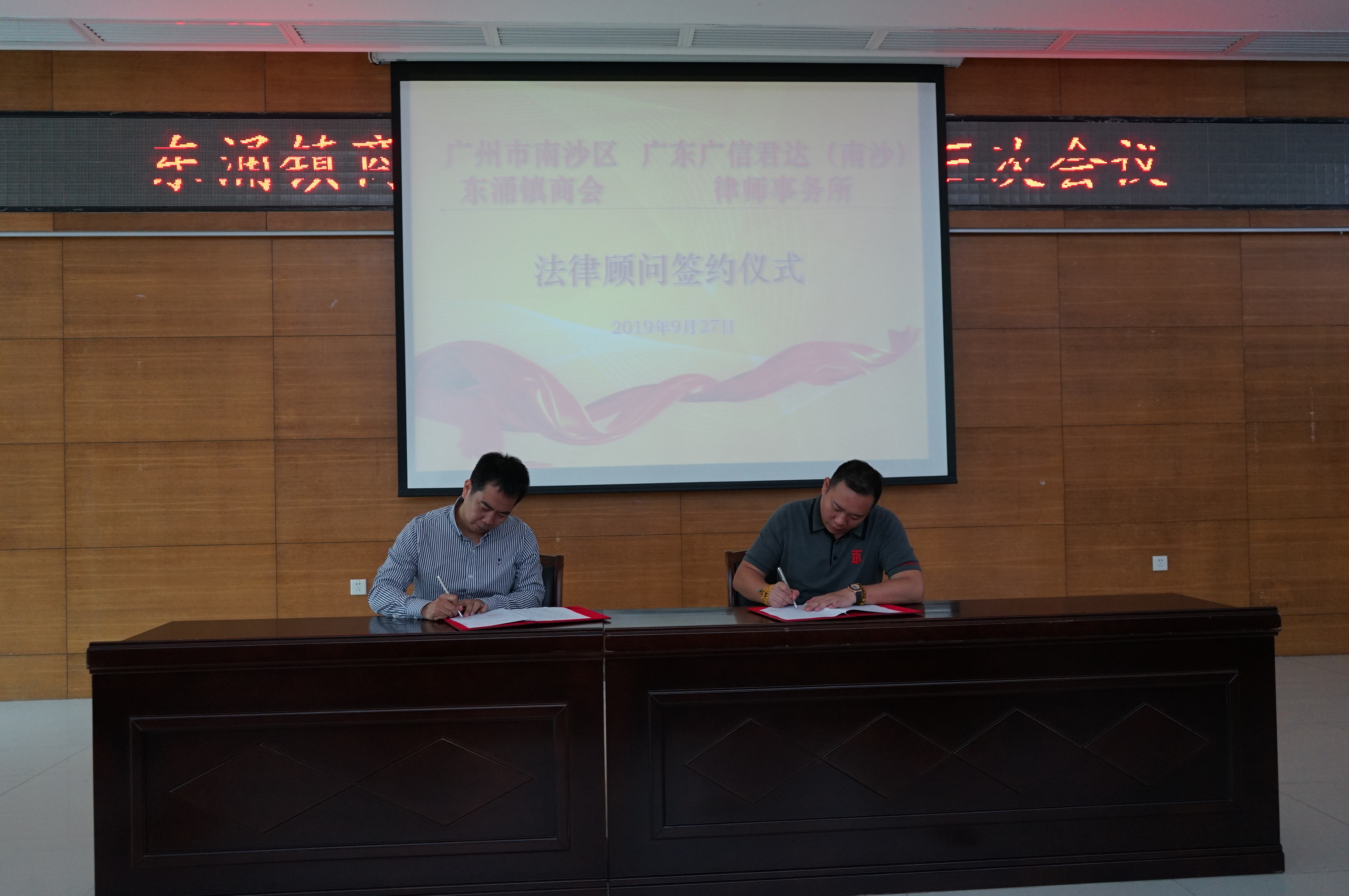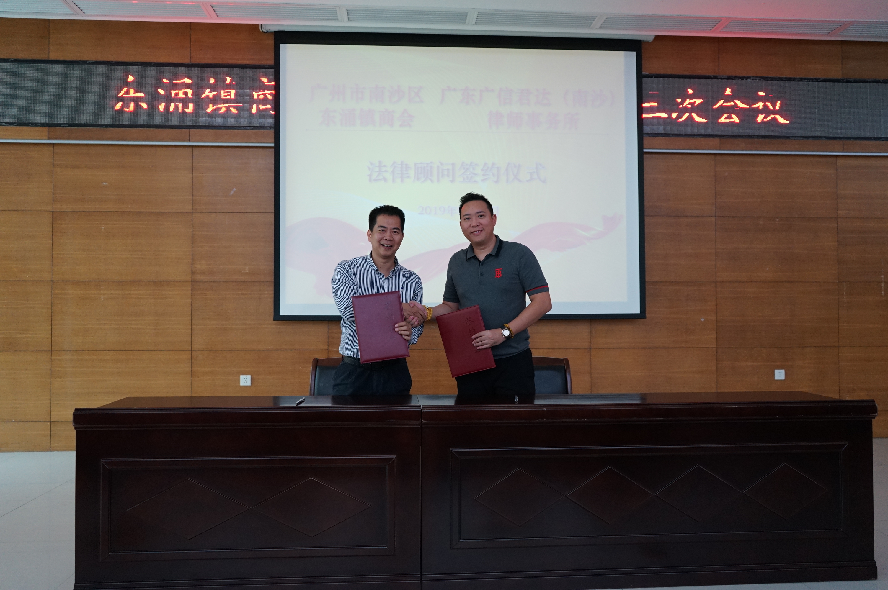2019年9月27日下午,南沙區東涌商會與廣東廣信君達(南沙)律師事務所(簡稱“廣信君達南沙分所”)常年法律顧問簽約儀式在東涌鎮文化中心舉行,與會人員有東涌商會全體商會理事代表、南沙區住房公積金管理中心代表、廣州誠粵技術服務有限公司代表等。