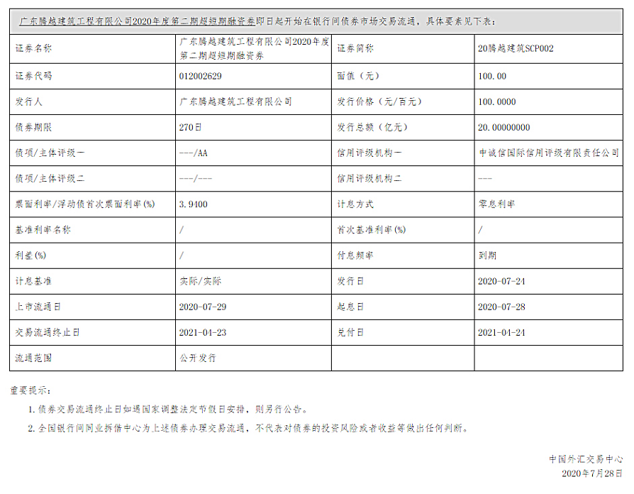 廣東騰越建筑工程有限公司(簡(jiǎn)稱“騰越建筑”)繼2020年4月22日成功發(fā)行金額為人民幣2億元的2020年度第一期超短期融資券(疫情防控債)(證券簡(jiǎn)稱:“20騰越建筑(疫情防控債)SCP001”)后,于7月24日成功發(fā)行2020年度第二期超短期融資券(證券簡(jiǎn)稱:“20騰越建筑SCP002”),發(fā)行金額為人民幣20億元,票面利率為3.94%,發(fā)行期限為270天,由碧桂園控股有限公司(股份代碼為2007.HK)提供擔(dān)保,華泰證券、中國(guó)銀行作為本次發(fā)行的牽頭及聯(lián)席主承銷商。