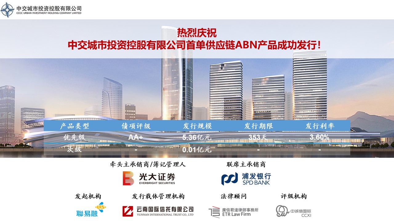 2020年9月21日,聯捷保理2020年度第一期中交城投供應鏈應付賬款資產支持票據成功發行,發行規模為5.37億元人民幣。其中,優先級發行規模為5.36億元,發行利率為3.60%,次級發行規模為0.01億元,發行期限為353日。后續將擇機在注冊額度內分期發行。