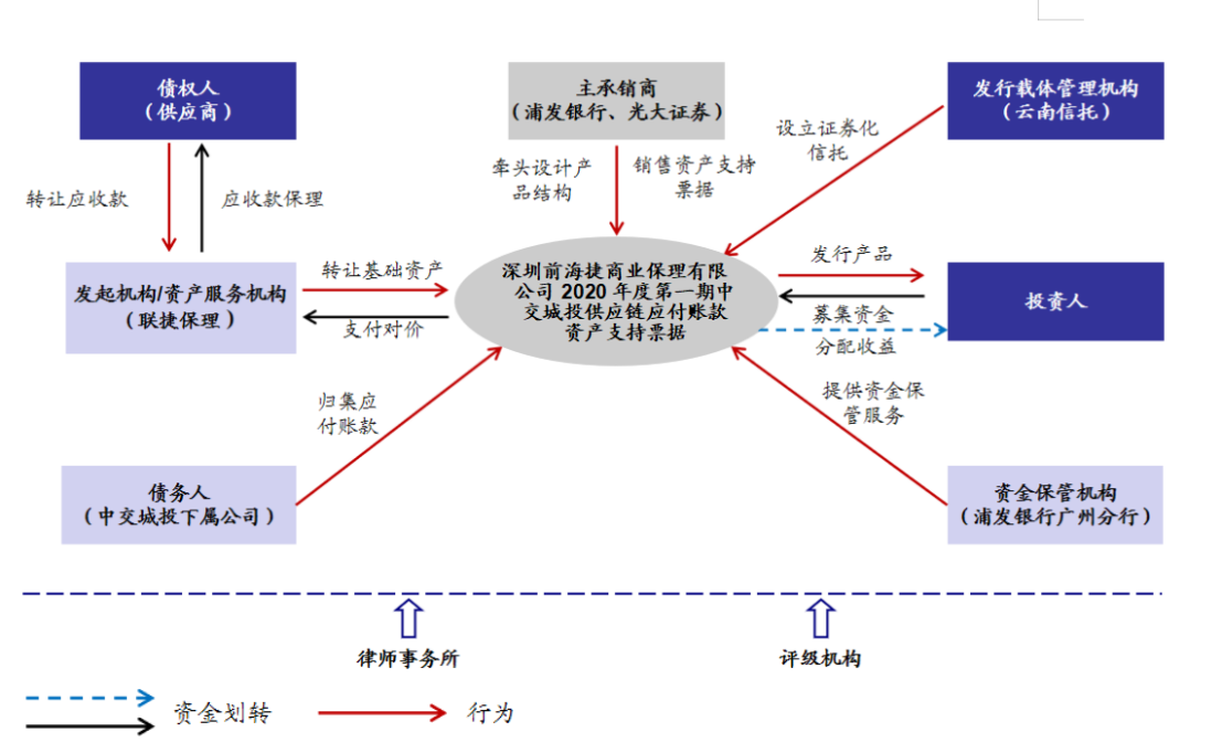2020年6月28日,中國銀行間市場交易商協會出具《接受注冊通知書》(中市協注【2020】ABN110號),同意深圳前海聯捷商業保理有限公司(下簡稱“聯捷保理”)作為發起機構注冊金額不超過30億元的資產支持票據,核心企業為中交城市投資控股有限公司(下簡稱“中交城投”)。廣信君達律師事務所擔任該項目的專項法律顧問。