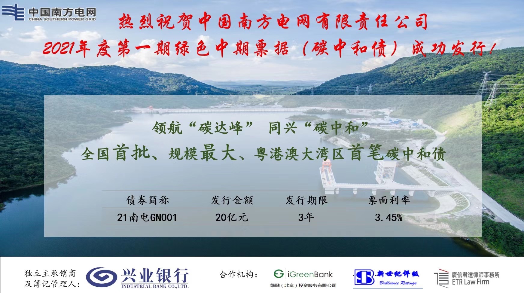 2021年2月7日,中國南方電網有限責任公司2021年度第一期綠色中期票據(碳中和債)成功發行,發行規模為20億元人民幣,發行期限為3年,發行利率為3.45%。本次碳中和債的主承銷商為興業銀行股份有限公司,評估認證機構為綠融(北京)投資服務有限公司,廣信君達律師事務所擔任本次項目的專項法律顧問。