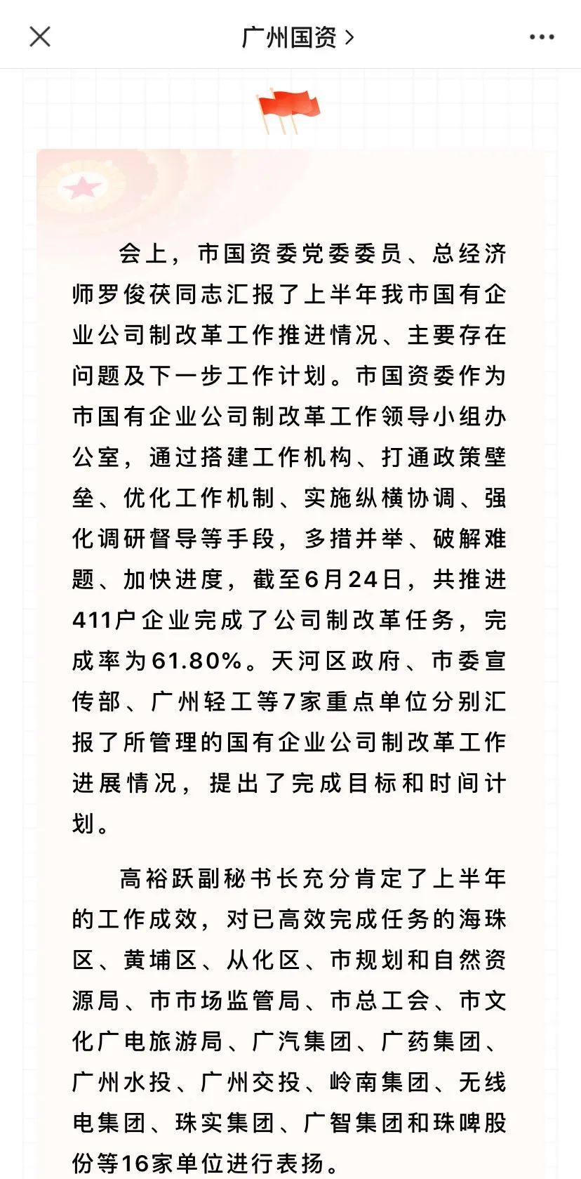 2020年6月30日,習近平總書記主持召開中央深改委第十四次會議,審議通過了《國企改革三年行動方案(2020—2022年)》,這是面向新發展階段我國深化國有企業改革的綱領性文件。為進一步貫徹黨中央、國務院關于推進國有企業公司制改革的決策部署,廣州市國資委積極督辦相關改革工作。
