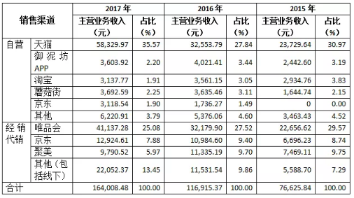 2014至2017年1-6月,天貓商城(包括天貓國際)、淘寶、唯品會、京東商城、聚美優品渠道產生的銷售收入占公司主營業務收入的比重合計分別為86.26%、83.04%、78.94%和80.52%,是公司主要的渠道,報告期內,發行人通過各主要渠道商進行銷售的情況如下: