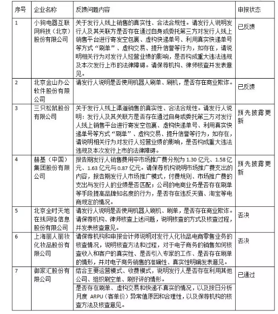 經我們檢索,至今共有7家企業在申請IPO時被直接反饋問及“刷單”問題,該等企業均為以線上銷售為主的企業,目前,唯一已成功過會的企業為御家匯,其對于解釋其不存在“刷單”情況的解釋具有一定的參考價值。