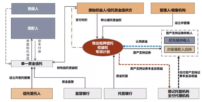 信托公司按照《信托合同》的約定,以自己的名義與借款人簽署《信托貸款合同》,將單一資金信托的資金貸給借款人,信托公司獲得信托貸款債權,即底層基礎資產;借款人以自己名下商業物業(即底層物業)在未來一定年限的運營收入作為償還信托貸款本息的主要來源,并將底層物業抵押給信托公司,作為按時足額向信托公司償還信托貸款本息的擔保。