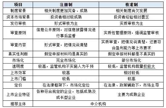 此外,從理論上講,注冊制體現的特征主要包括:(1)形式審核。(2)法治化的上市程序。(3)嚴格信息披露。(4)完備的事后監管。總體而言,注冊制與核準制體現為如下異同: