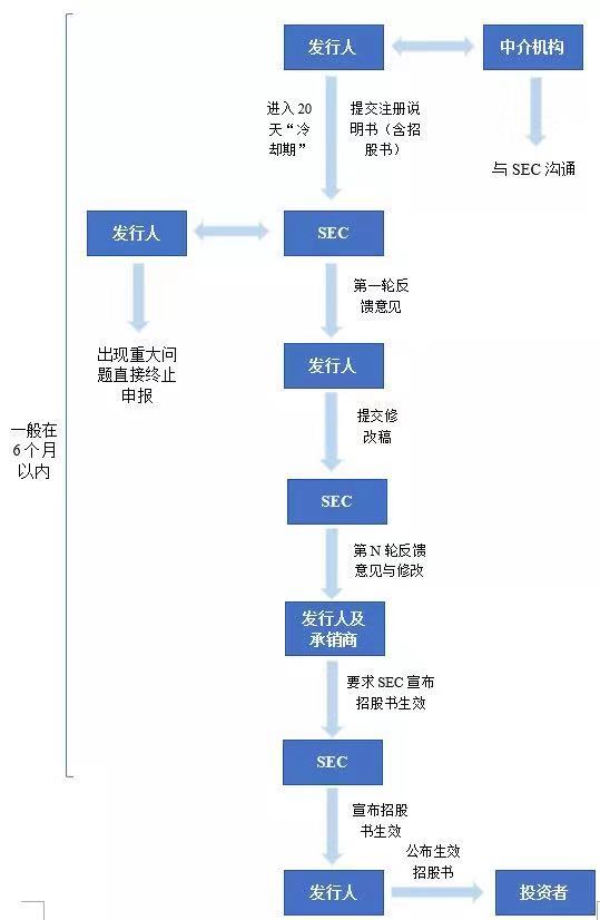 在審核程序上,企業和承銷商向SEC提交注冊登記書,獨立審計人員向SEC提供一份審計報告,SEC根據企業的性質組織審核小組進行審核,并根據審核情況發出意見書,意見書主要集中于企業的信息披露問題,如公司的產品、服務等所屬行業情況;新產品的開發、生產、營銷以及客戶滿意度;是否有關聯交易未被披露等,如果SEC認為還有信息沒有披露的,將持續發問。當然,SEC也會關注企業的盈利狀況,但僅限于要求完整履行信息披露義務,并披露投資者關注的信息,不會對盈利提出具體的指標。SEC的注冊程序如下圖所示: