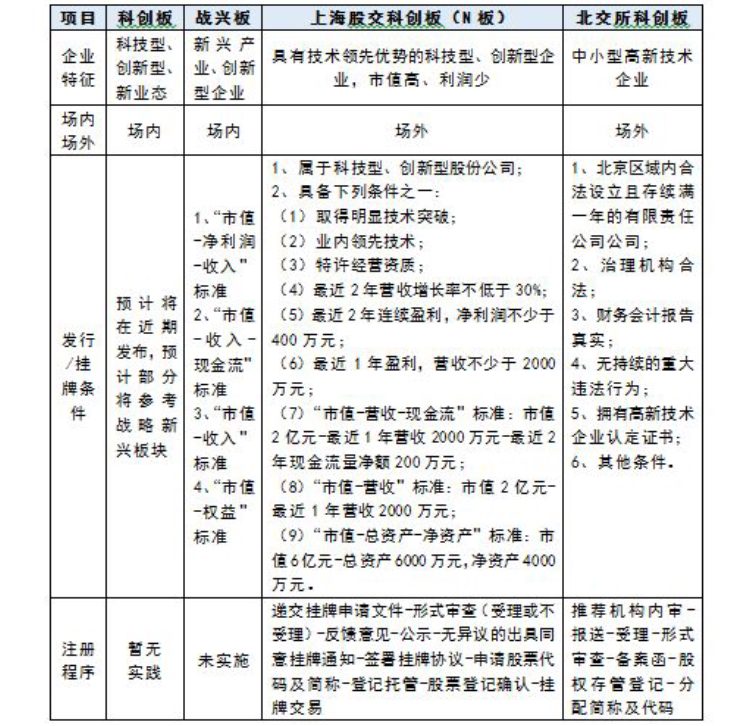 (一)科創板與戰興板、上海股交N板及北交所科創板之間的對比