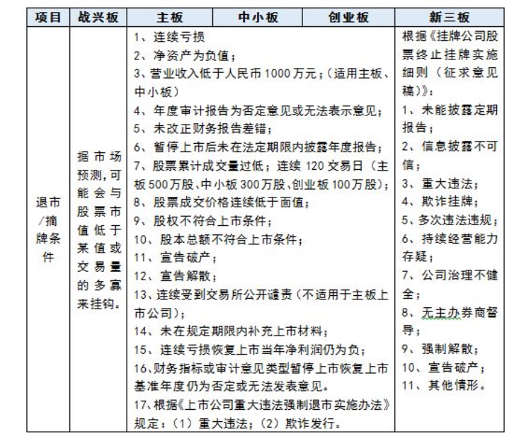 結合此前傳聞的戰興板退市條件,目前實行的主板、中小板及創業板退市條件,以及實際上已在運作的新三板掛牌公司摘牌細則等規定,各板塊的終止上市/掛牌條件如下表所示: