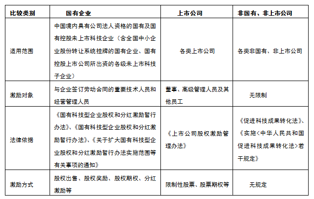 國有企業(yè)的股權(quán)激勵、上市公司股權(quán)激勵、非上市公司股權(quán)激勵分別適用不同的法律法規(guī),具有不同的適用對象、不同的操作模式、不同的激勵工具,認(rèn)識到這一點是開展股權(quán)激勵工作的基本前提。下圖從適用范圍、法律依據(jù)、開展模式等方面對三種股權(quán)激勵進(jìn)行初步比較,以便對股權(quán)激勵進(jìn)行體系化理解。