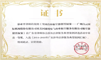 ◆2019年4月,慕亞平律師代理的全國首例航空器留置權(quán)案入選廣州法院“十大涉外民商事審判典型案例”